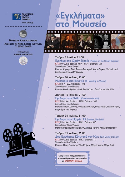Το Πολιτιστικό Ίδρυμα Ομίλου Πειραιώς (ΠΙΟΠ), σε συνεργασία με τον Δήμο Ιωαννιτών, οργανώνει από τις 3 έως τις 31 Ιούλιου 2024, θερινό κινηματογραφικό αφιέρωμα με τίτλο «Εγκλήματα» στο Μουσείο, στον υπαίθριο χώρο του Μουσείου Αργυροτεχνίας, στα Ιωάννινα. Στο αφιέρωμα περιλαβάνονται συναρπαστικές ταινίες μυστηρίου που βασίζονται σε μυθιστορήματα της «βασίλισσας του εγκλήματος» Άγκαθα Κρίστι.