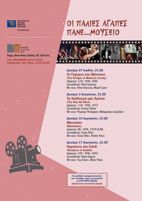 Το Πολιτιστικό Ίδρυμα Ομίλου Πειραιώς (ΠΙΟΠ) οργανώνει θερινό κινηματογραφικό αφιέρωμα με τίτλο «Οι παλιές αγάπες πάνε…μουσείο», κάθε Δευτέρα από τις 27 Ιουλίου έως τις 17 Αυγούστου (ώρα 21:00), στο Μουσείο Μαστίχας Χίου. Το αφιέρωμα περιλαμβάνει τέσσερις αγαπημένες ρομαντικές ταινίες από τα 70’s και τα 90’s που μιλούν για μεγάλους έρωτες.